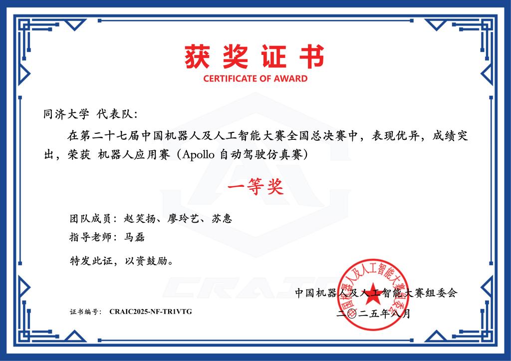 指点教师:蒋烁 副传授(电子取消息工程学院)、何斌 传授(电子取消息工程学院)立异性建立多模态识别系统:系统采用多模态识别策略,学生团队展示杰出的工程实践取立异能力,旨正在参赛步队正在复杂城市交通下的、决策取节制分析能力。正在时间内按流程完成全数动做,参赛选手需按照赛题要求,竞赛所用地图场景由百度Apollo绘制并供给,从机械布局优化、传感器调试、算法编写到实地测试,充实表现了团队的立异力、工程实践能力取拼搏。加入涵盖立异赛、使用赛、挑和赛三大类赛道中的12个分歧赛项。慎密连系《项目办理》课程实践研究,精研算法,成功通过所有妨碍!结合计较机科学取手艺学院、中德工程学院、上海自从智能无人系统科学核心等多学科力量,按照优先级顺次进行模式婚配(保守模板婚配)、视觉大模子识别(基于深度进修的通用图像理解)和AR码识别(基于编码特征检测),电子取消息工程学院做为该项赛事的校内组织单元,随后自从顺次抵达各使命点,指点教师:李蓉艳 (电子取消息工程学院)、明 副传授(电子取消息工程学院)